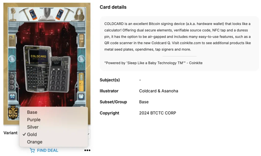- Collaborations & Commemoratives: Special cards tied to conferences and partnerships, including collaborations with Bitcoin Magazine.